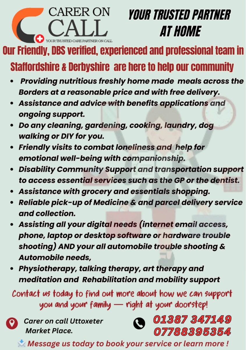September 3, 2025At Carer on Call Uttoxeter, our friendly, DBS-verified, and experienced care team is here to support families and individuals across Staffordshire and Derbyshire. We provide reliable, compassionate, and professional care services to make everyday life easier, safer, and more comfortable.