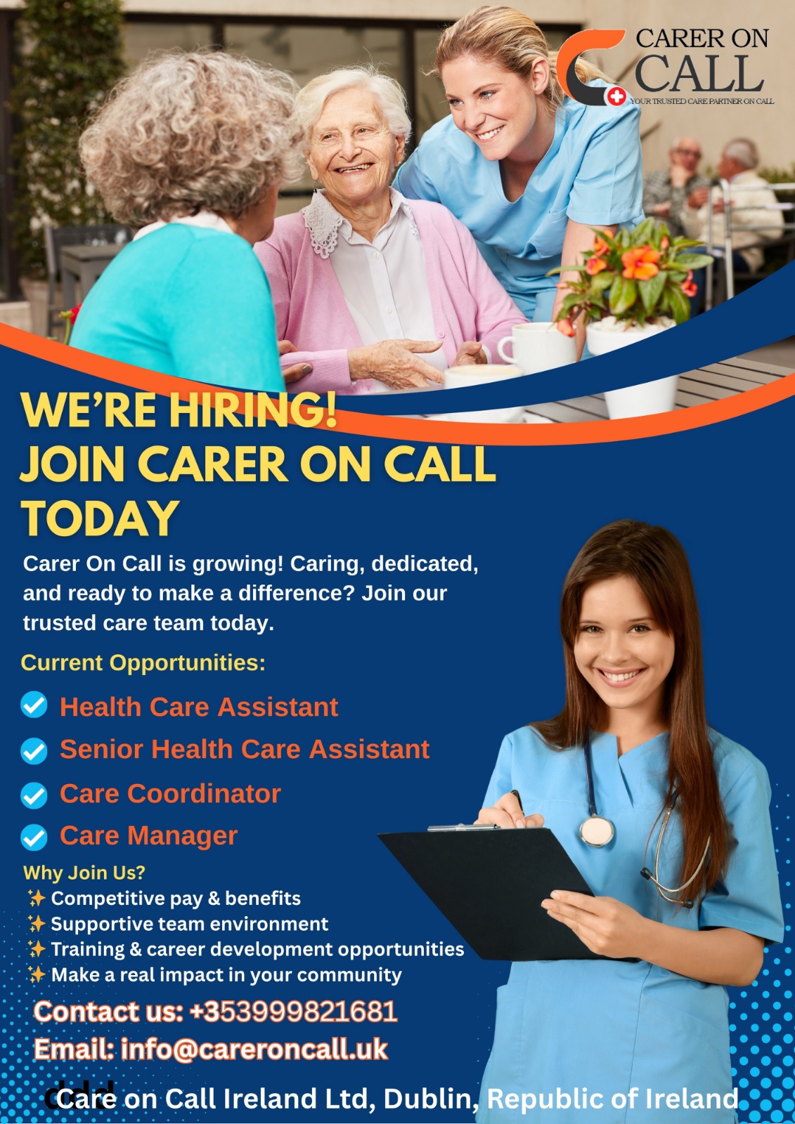 Whether you are a healthcare professional seeking exciting opportunities or a facility in need of top-tier care solutions, Carer on Call is here to serve you. Join us in our mission to elevate healthcare to new heights and experience the difference that quality care and expertise can make.